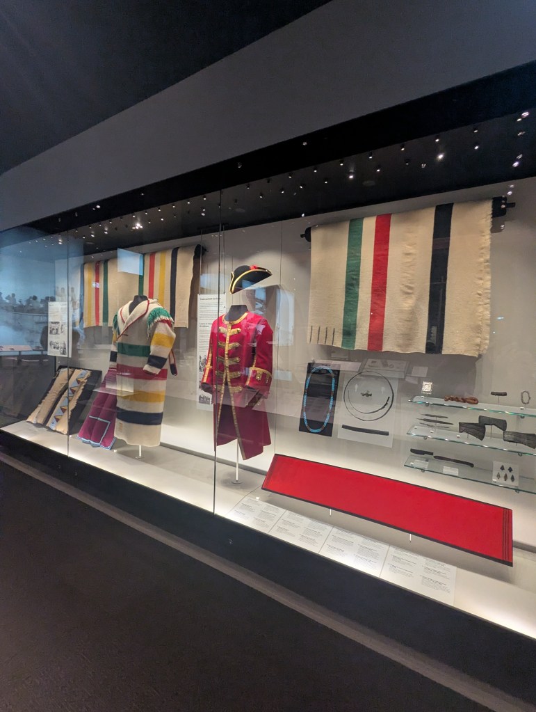 Les fameuses couvertures à bandes colorées – blanche avec des rayures verte, rouge, jaune et bleue – étaient autrefois une monnaie d’échange prisée dans le commerce des fourrures. Elles symbolisaient le prestige et l’influence de la Compagnie.