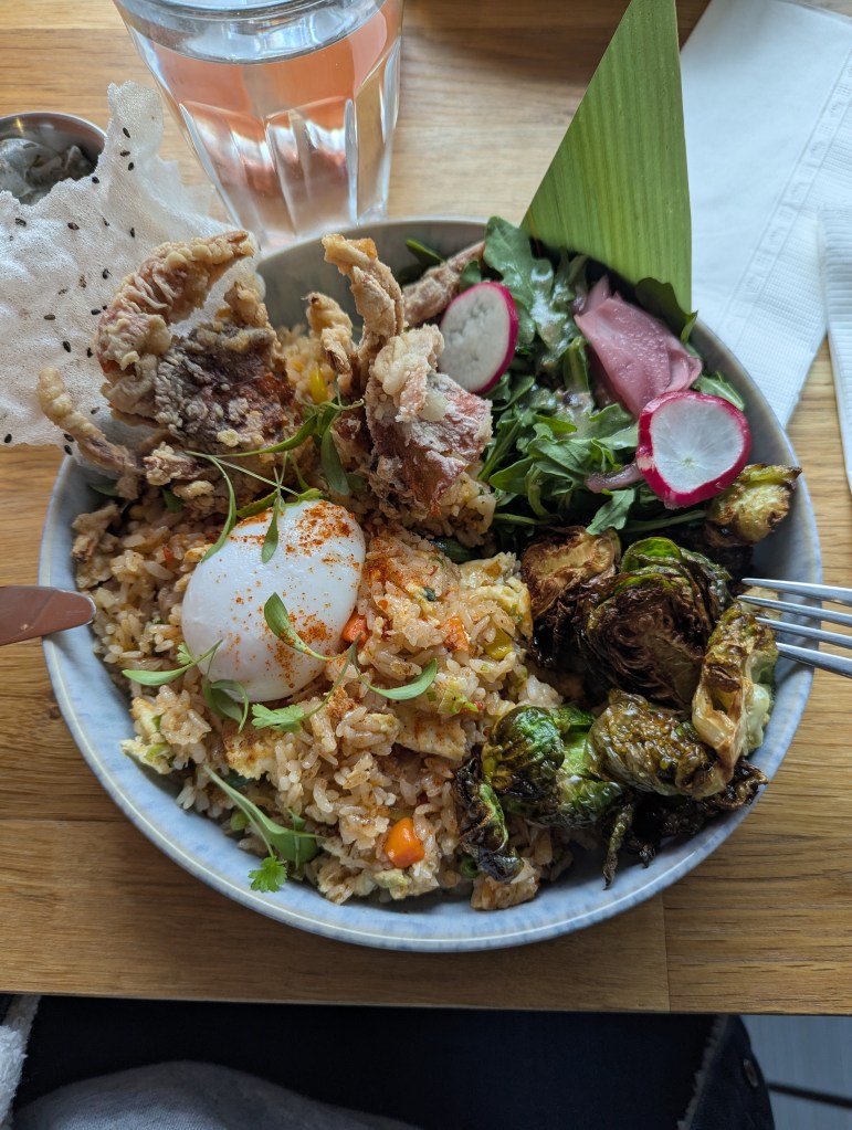 Parmi les propositions les plus remarquées : les soft shell crabs. Un choix audacieux pour un brunch… mais parfaitement exécuté. Le contraste entre le croustillant, le moelleux du pain et la richesse des accompagnements crée une assiette à la fois gourmande et originale.