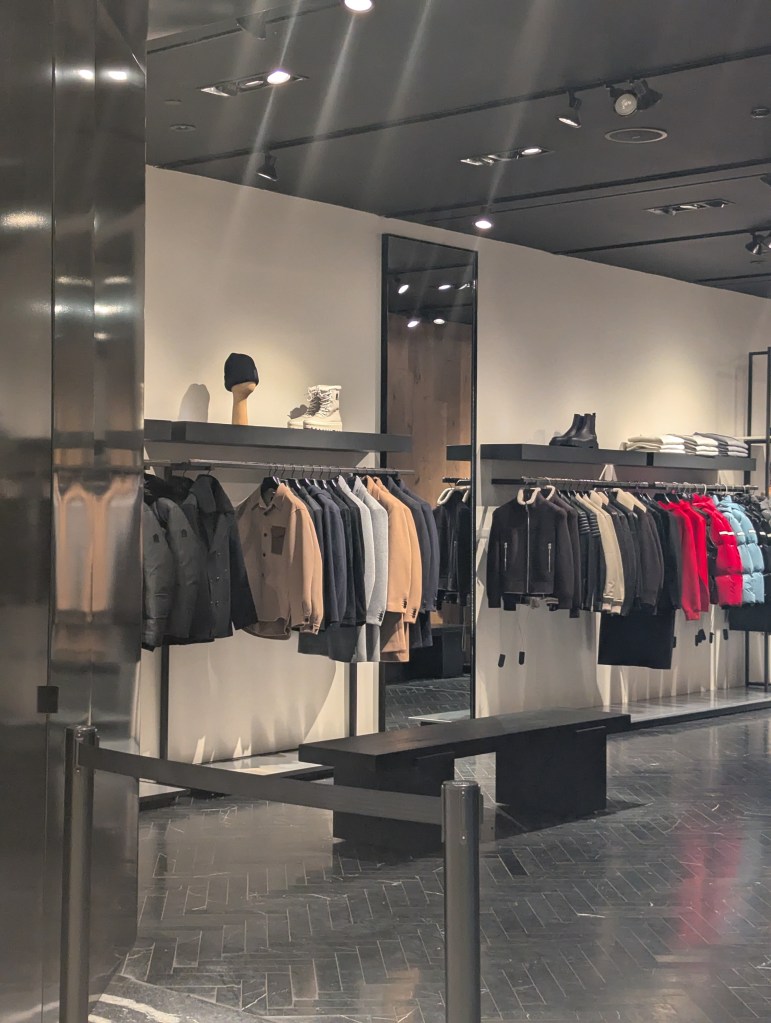Canada Goose reste incontournable, ne serait-ce que pour l’expérience proposée en boutique. Les espaces sont très pédagogiques : températures, performances, conditions extrêmes, on vous explique tout. Vous pouvez même voir exposé un patron du mythique « Big Red » lequel voit certains de ces éléments systématiquement repris dans les nouveaux modèles, tant ce modèle est la pierre angulaire de la marque. N’oublions pas que ces manteaux (matières et coupes) ont été utilisés pour des missions en Antarctique. C’est dire la robustesse, la fiabilité et le savoir fait de cette marque. On comprend pourquoi la marque est devenue un symbole du Canada moderne et du vêtement que l’on veut avoir pour affronter le froid.