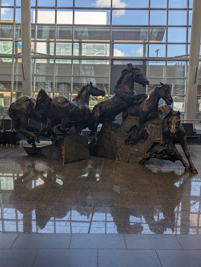 🐎 Et comme un clin d’œil à l’esprit cowboy de la province, on croise aussi plusieurs sculptures en bronze de chevaux — une belle manière d’annoncer la couleur avant même de quitter le terminal.