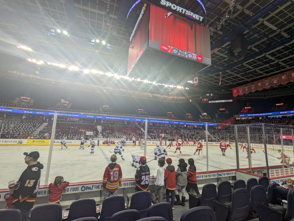 Assister à un match des Calgary Wranglers, c’est plonger dans une véritable fête locale où le hockey est un spectacle à part entière. Les USA ont le basket ou le football américain, le Canada est LA nation du Hockey. Ce sport est une passion populaire, intergénérationnelle, et chaque rencontre est un événement qui fédère. L’arrivée des joueurs sur la glace — digne d’une entrée de gladiateurs — embrase l’arena et l’ambiance monte d’un cran. Un film d’introduction projeté sur les écrans géants illustre l’héritage western de la ville et de l’équipe. Flammes rouges, images de cowboys, visages de joueurs, et ce message clair : « This is our house, we gonna rock this town. »